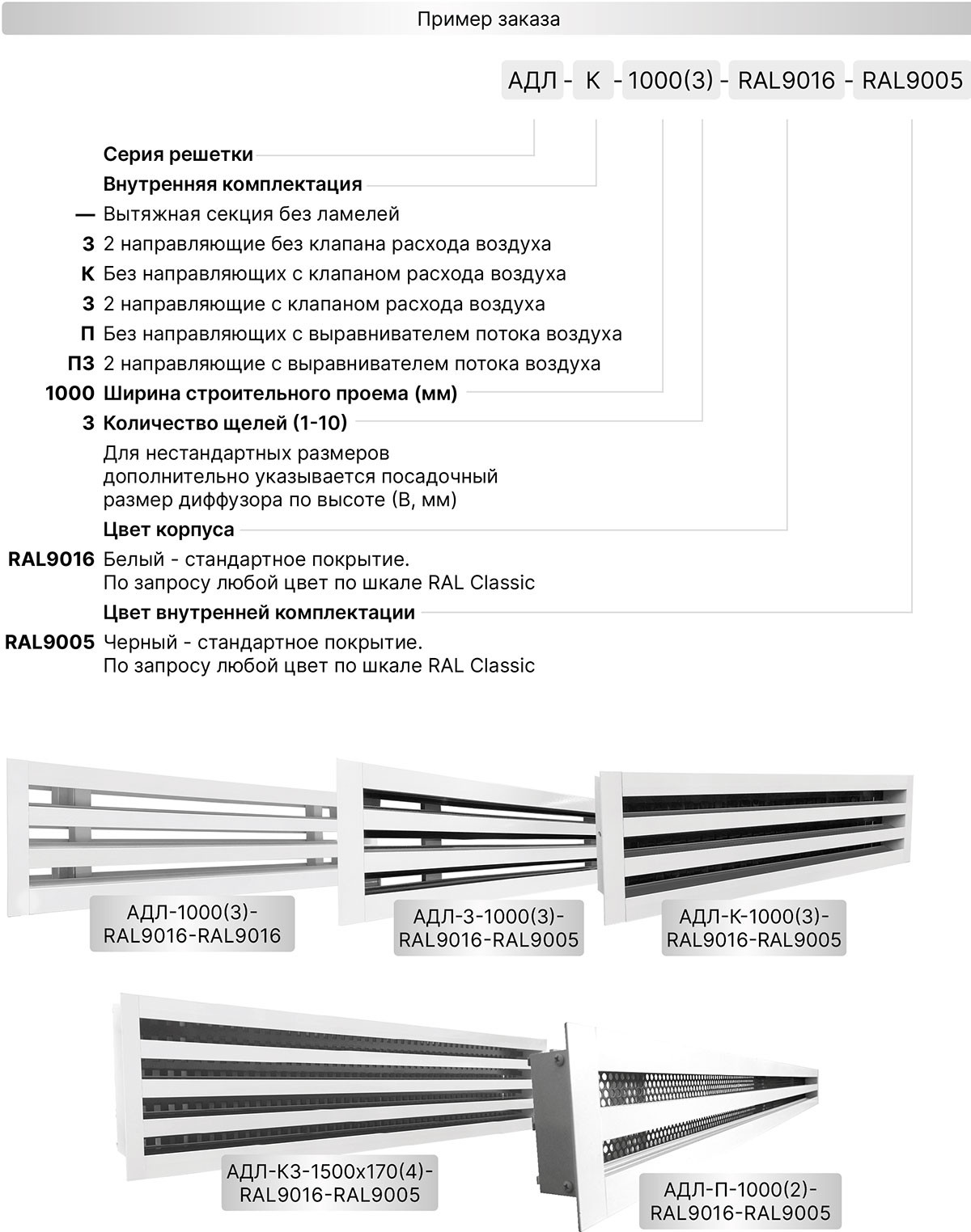В этом виде решеток отсутствуют направляющие потока воздуха, но есть клапан расхода воздуха. За счет чего АДЛ-К может применяться как в вытяжной, так и в приточной системе вентиляции, регулируя объем подаваемого воздуха. Могут быть самостоятельным изделием в виде одиночной секции или ее составной частью. Возможное количество щелей от 1 до 10.